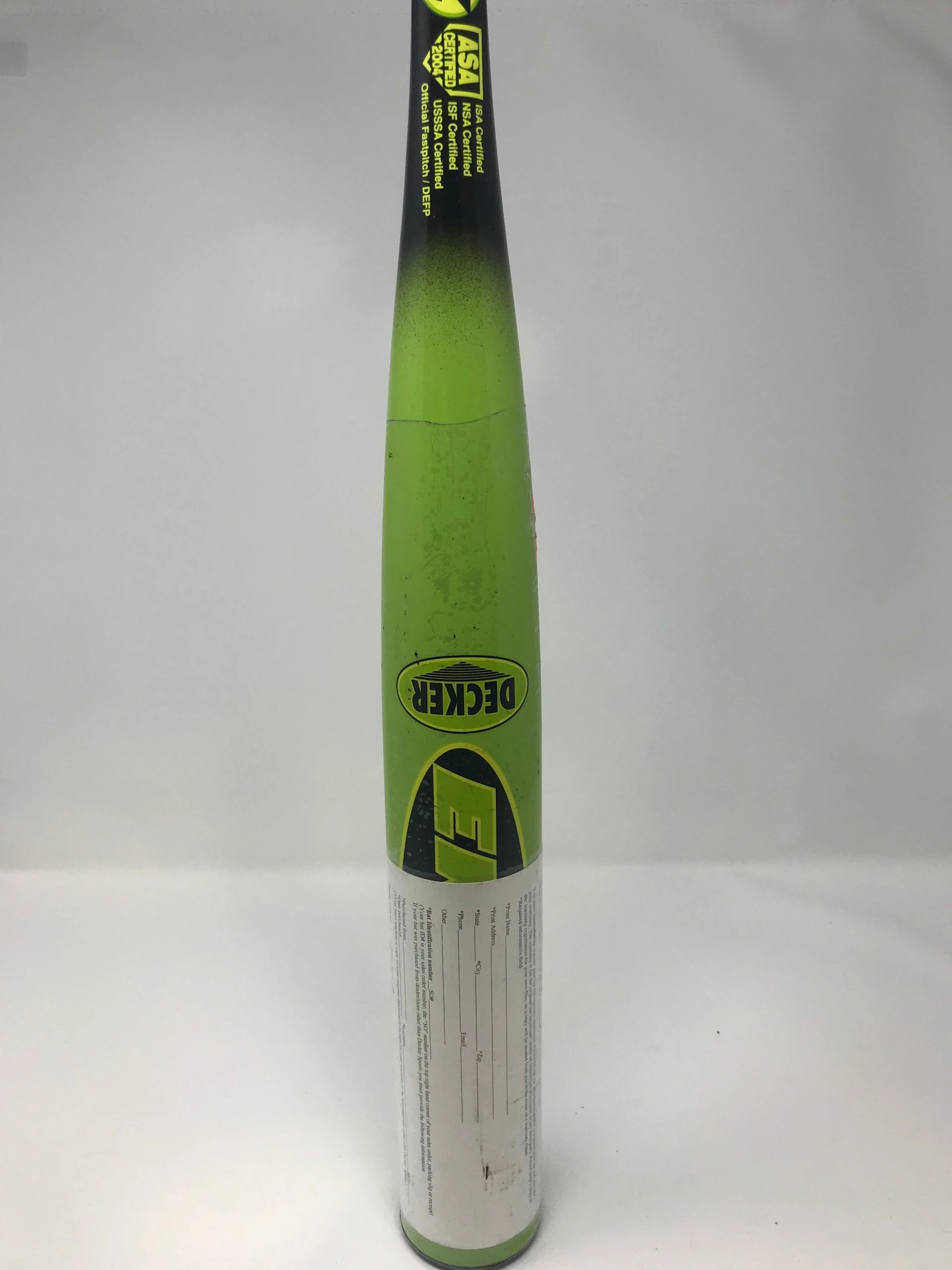 New Decker Enigma Softball bat. Anisotropic, Variable Composite, Certified with the ISA, NSA , ASA and USSSA (no Stamp),